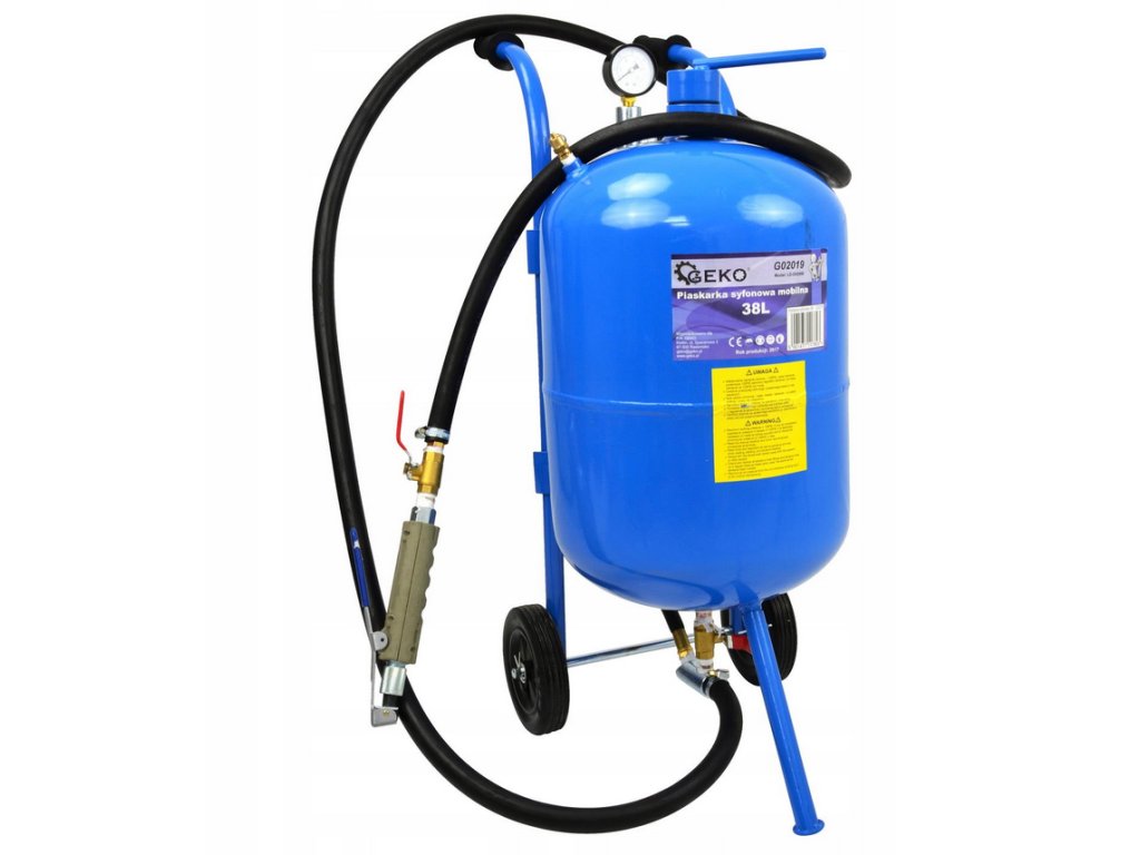 Sifónová stierka 38L . Zariadenie má mnoho aplikácií. Môže sa používať pri renovácii, údržbe, karosárskych a mechanických službách vo výrobných závodoch atď. Celá súprava zaručuje BEZPEČNÉ používanie vďaka ochrannej maske zobrazenej na fotografii (maska má zabudovanú plastovú dosku na obmedzenie viditeľnosti a ochranu tváre). Zariadenie je vybavené gumovými kolieskami, odtokom kondenzátu a manometrom.