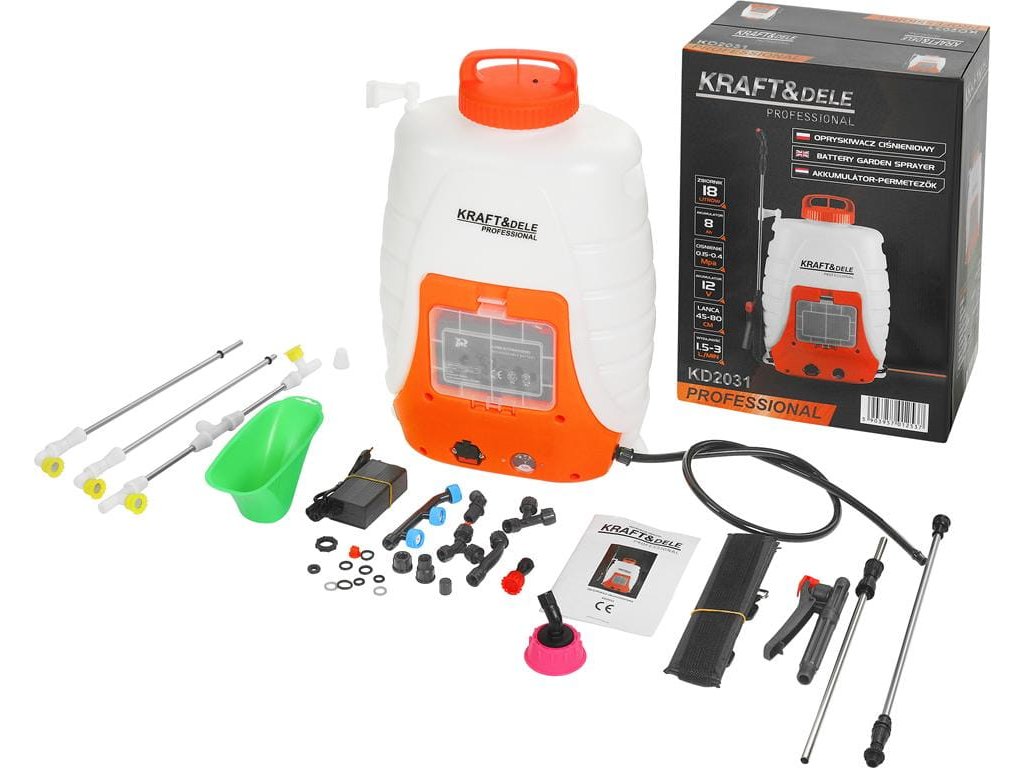 - TECHNICKÉ PARAMETRE Značka výrobku: KRAFT&DELE Model: KD2031 Objem nádrže: 18 l Pracovný tlak: 1 - 4,5 baru Typ čerpadla: membránové Maximálny čas striekania po úplnom nabití: 8 h Čas nabíjania batérie: 12 h Výstupná kapacita jednoduchej trysky: 1,5 - 1,6 [l/min] Výstupná kapacita dvojitej trysky: 1,8 - 3 [l/min] Batéria Nominálne napätie: 12V DC Kapacita batérie: 8Ah Typ batérie: olovnato-kadmiová Maximálny čas nabíjania: 8h Nabíjačka Napájacie napätie: 230V/50Hz Výstupné napätie: 12V Nabíjací prúd: 1A SADA OBSAHUJE: Akumulátorový postrekovač KD2031 Príslušenstvo Originálne balenie Potvrdenie o prevzatí/FV