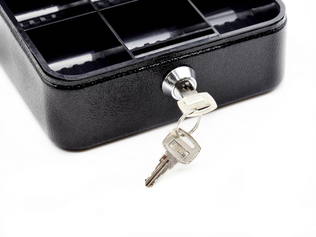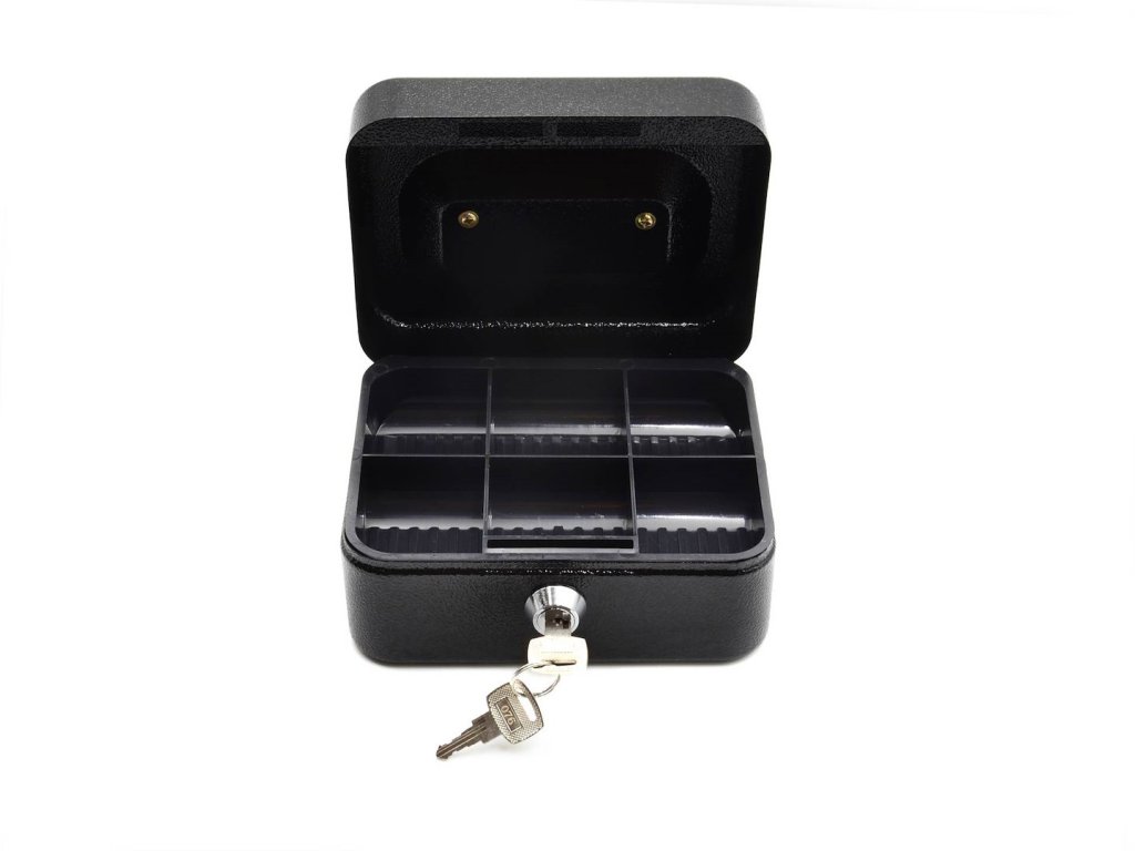 Kovová pokladnička. Uzatvárateľná kľúčom (2 ks v sade). Vybavená rukoväťou na prenášanie. Vnútri plastová vložka s priehradkami: