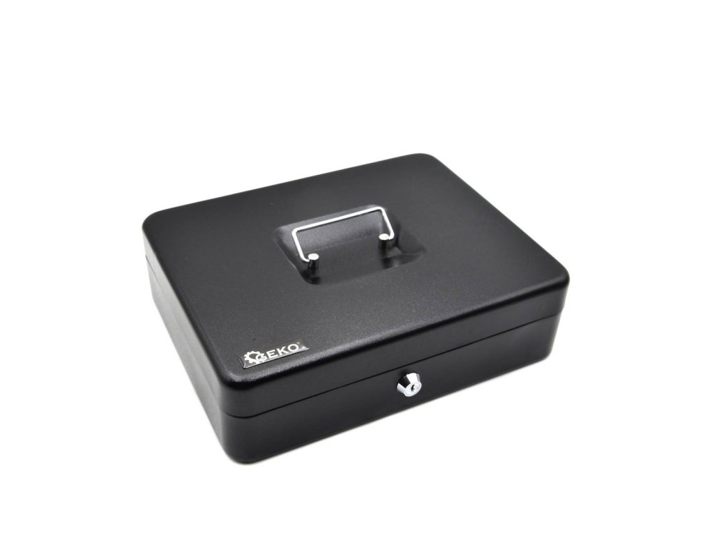 Kovová pokladnička. Uzatvárateľná kľúčom (2 ks v sade). Vybavená rukoväťou na prenášanie. Vnútri plastová vložka s priehradkami: