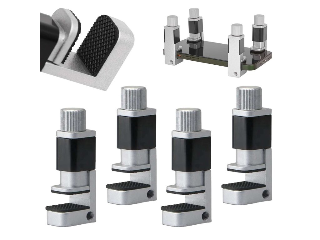 - Pogumované prítlačné plochy: Každý zverák je vybavený pogumovanými prítlačnými plochami, ktoré zabezpečujú jemné uchopenie displeja bez rizika poškodenia. Pogumované plochy tiež minimalizujú sklz a zaisťujú pevné a stabilné uchytenie.