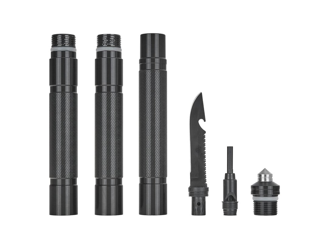 - Vodotesná rukoväť utesnená O-krúžkami umožňuje uložiť do rukoväte materiály, ako sú zápalky, tekutina do zapaľovačov a iné predmety citlivé na vlhkosť.