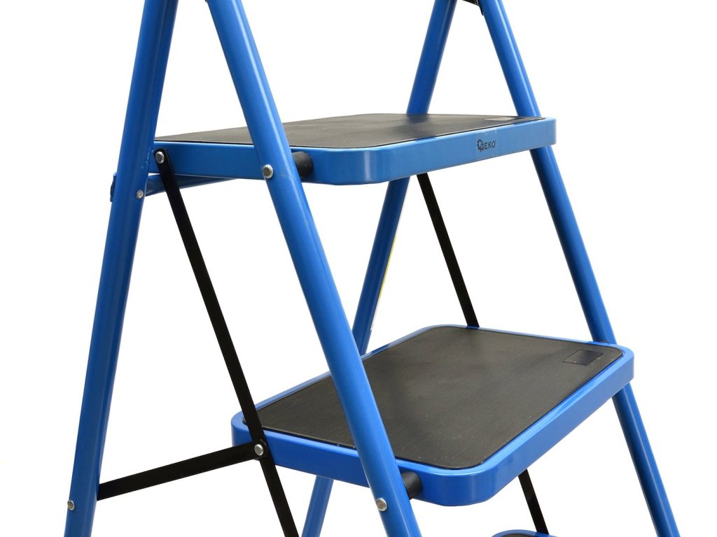 Skladací kovový rebrík s tromi priečkami je praktickým nástrojom na rôzne práce vo výške. Rebrík má modrú farbu a čierne prvky, ktoré mu dodávajú elegantný vzhľad.Každá priečka je pokrytá čiernym nerovným povrchom, ktorý zaručuje pohodlie a istotu pri chôdzi.