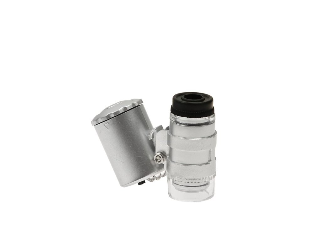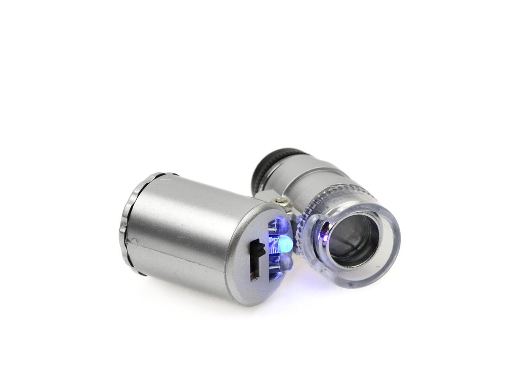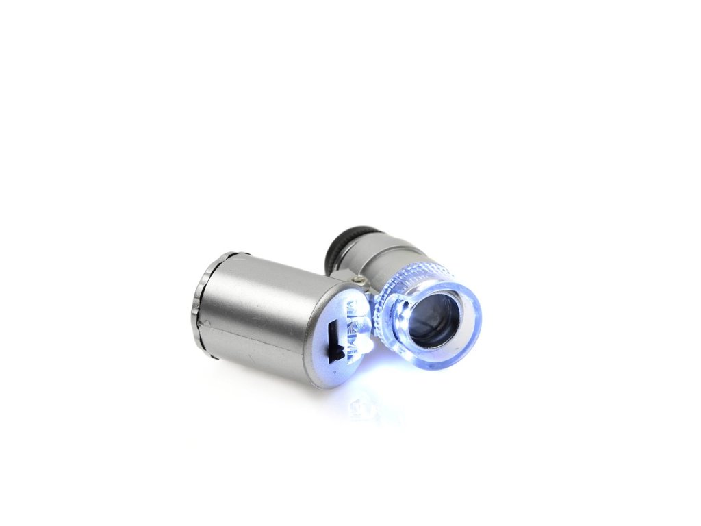 Vreckový mikroskop na pozorovanie malých predmetov so 60-násobným zväčšením. Vhodný pre klenotníkov, hodinárov, numizmatikov, elektronikov atď. Vybavený 3 osvetľovacími diódami, dve vyžarujú biele svetlo, tretia dióda je UV dióda.