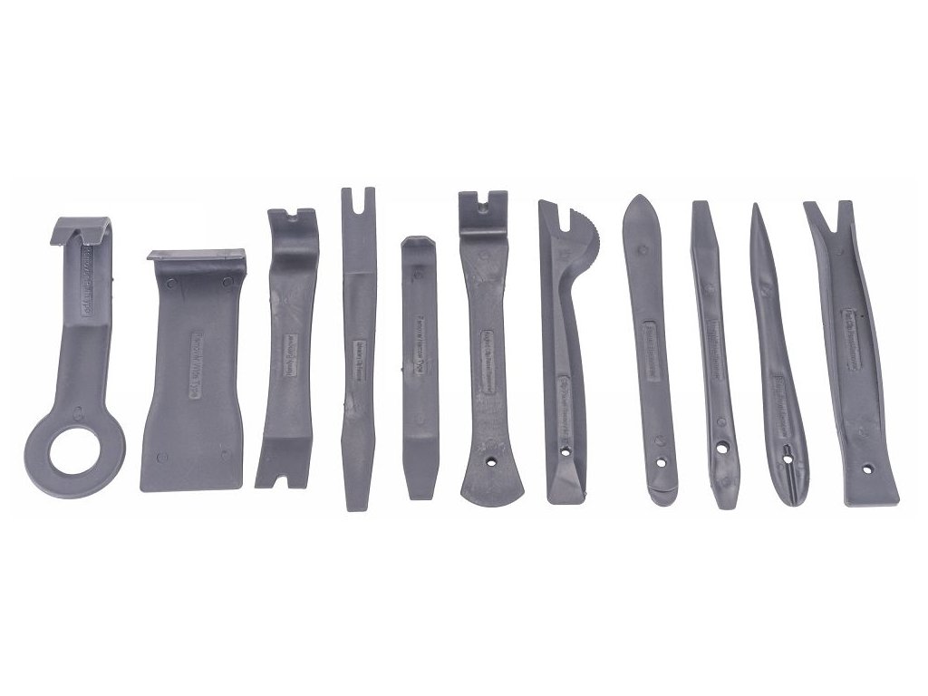 Bezpečná demontáž vnútorných komponentov bez poškodenia. Sada obsahuje 11 rôznych nástrojov určených na odstraňovanie čalúnenia, plastových panelov, obloženia a upevňovacích svoriek, najmä v automobiloch. Špeciálne tvary umožňujú pákový efekt a uľahčujú prácu aj na ťažko prístupných miestach.
