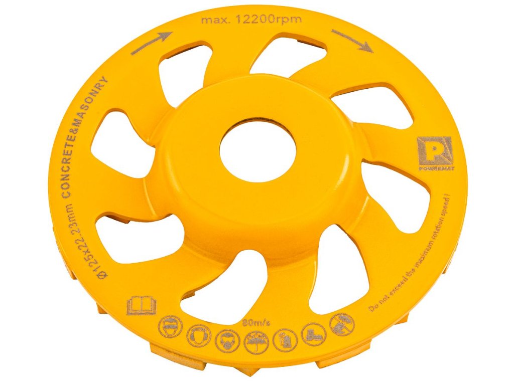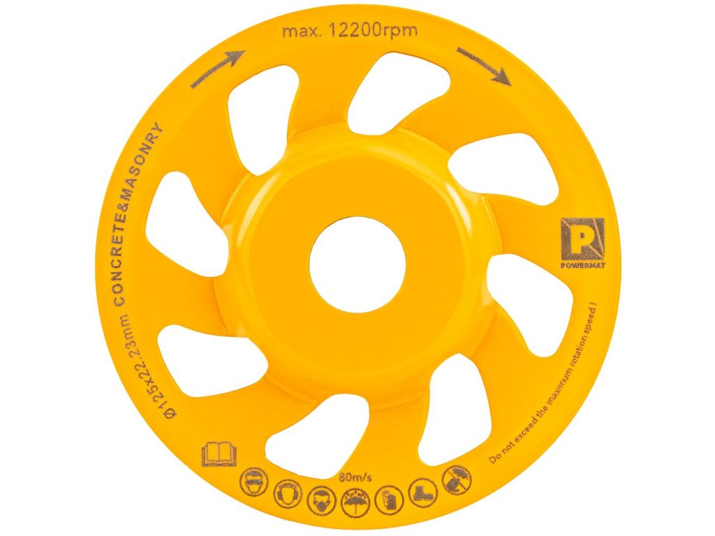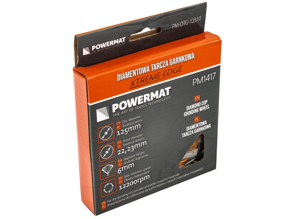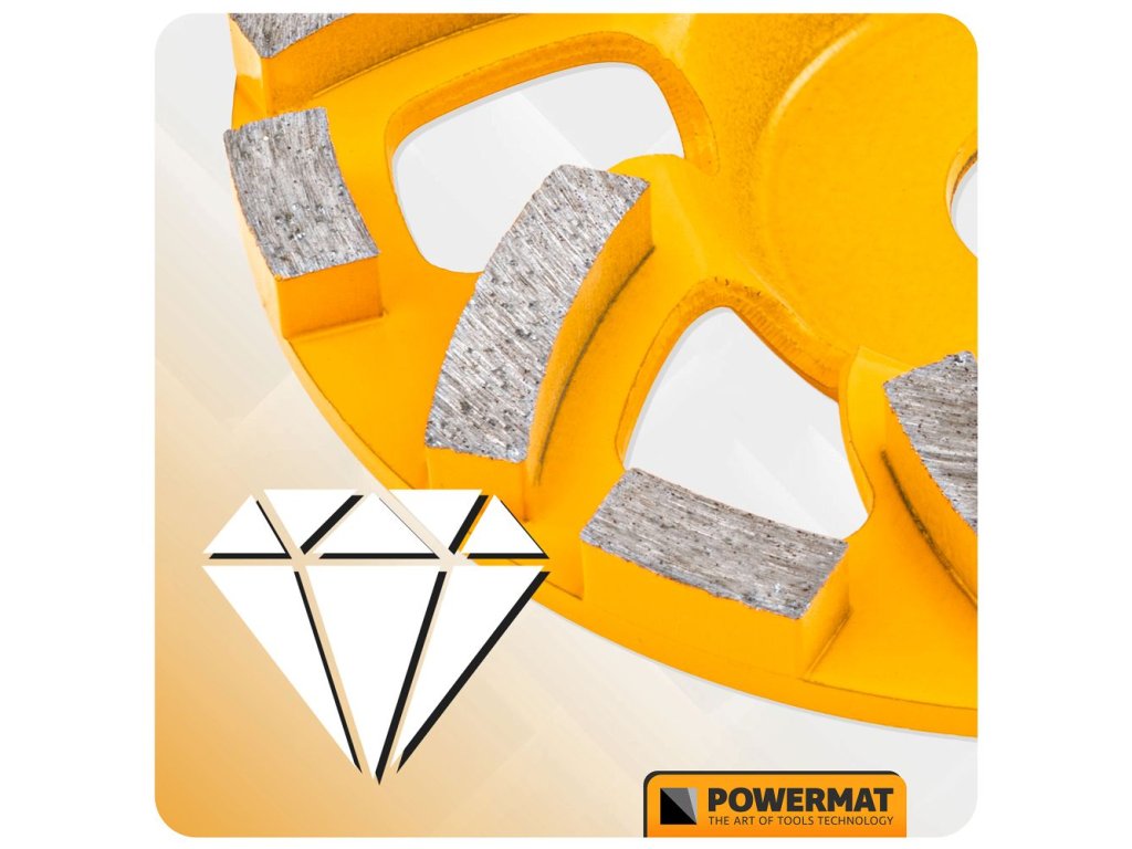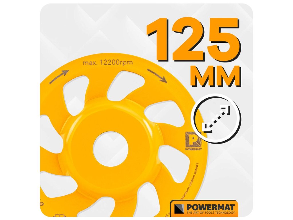 Diamantový brúsny kotúčPOWERMAT PM-DTG-1251T je navrhnutý na efektívnebrúsenie betónu, kameňa a iných tvrdých stavebných materiálov. Výborne sa hodí na vyrovnávanie nerovností, odstraňovanie prebytočných vrstiev a prípravu povrchu pred ďalšou úpravou.