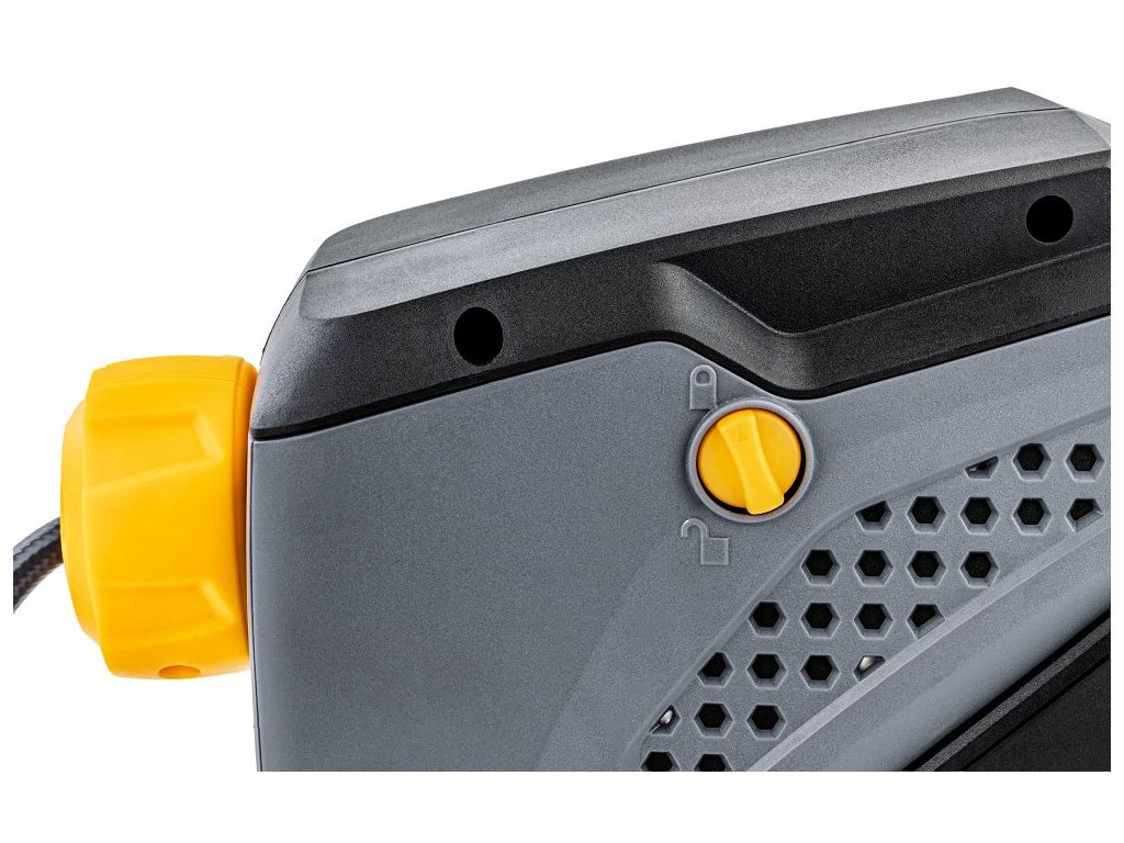 Dostatočný rozsah na prácu v celej dielni. Držiak umožňuje otáčanie bubna, takže sa hadica nekrúti a neodiera.