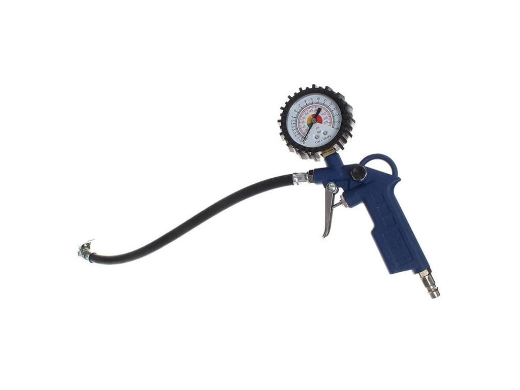 - Pumpovacia pištoľ s manometrom - základná pištoľ na kontrolu a hustenie pneumatík, vybavená gumovým krytom manometra a ventilom na vypúšťanie vzduchu.