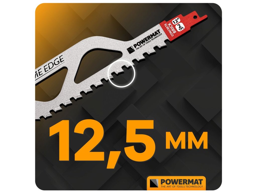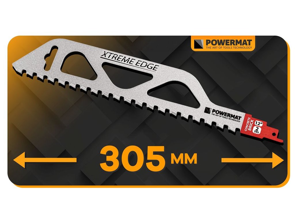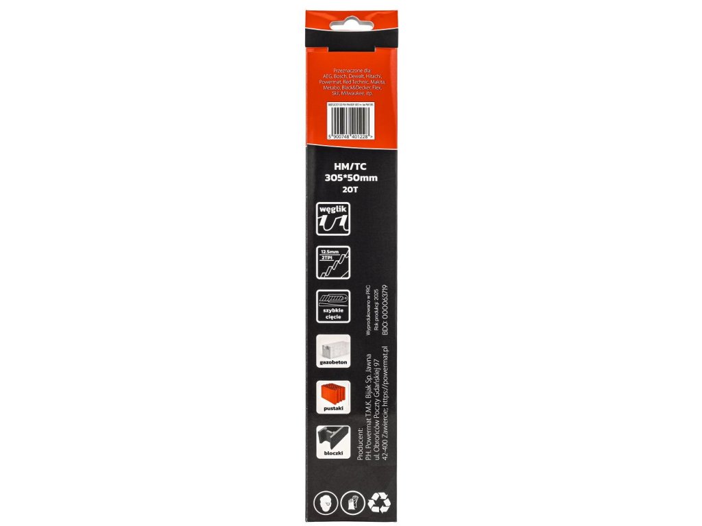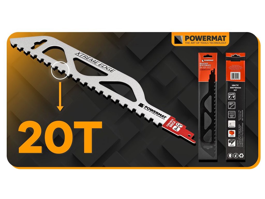 Odolnékarbidový plátok (HM/TC) PowermatPM-BDP-305T prešabľové píly. Vďaka dĺžke 305 mm zvládne aj hlbšie rezy ajemnejšie ozubenie 20 TPI podporuje rýchle a stabilné rezanie stavebných materiálov. Univerzálne upínanie je vhodné pre väčšinu šabľových píl.