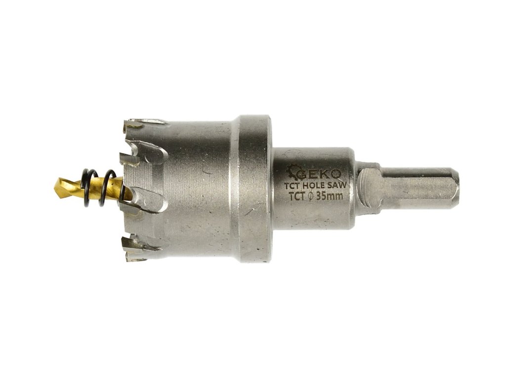 TCTotvor do kovu oveľkosť 35 mm. Čepele sú vyrobené zspekané karbidyktoré sa vyznačujú oveľa vyššou tvrdosťou a odolnosťou voči vysokým teplotám v porovnaní s rýchloreznou oceľou HSS. Sú určené na vŕtanie otvorov s väčším priemerom do ocele, liatiny, neželezných kovov, dreva, plastov atď. Na zvýšenie presnosti rezania sa používa vodiaci vrták z ocele HSS. Pružina namontovaná na vodiacom vrtáku umožňuje ľahké vybratie vŕtaného materiálu.