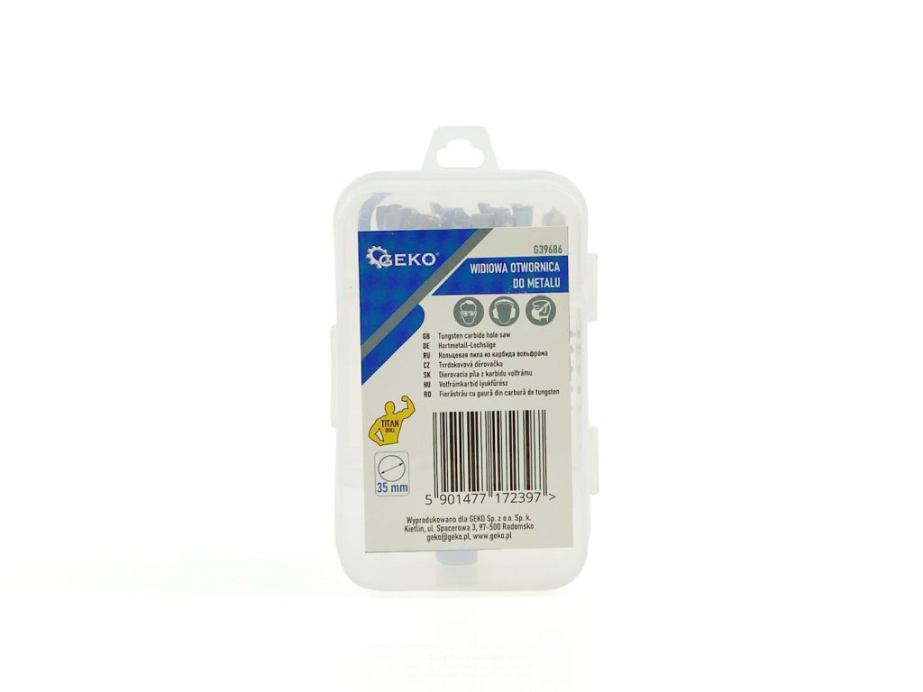 Kovový razník TCT s veľkosťou 35 mm. Čepele sú vyrobené zo spekaných karbidov, ktoré sa vyznačujú oveľa vyššou tvrdosťou a odolnosťou voči vysokým teplotám v porovnaní s rýchloupínacou oceľou HSS. Sú určené na vŕtanie otvorov s väčším priemerom do ocele, liatiny,..