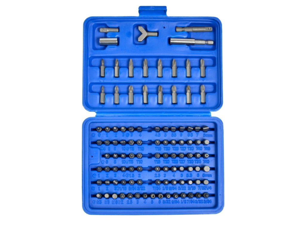 100-dielna súprava bitov zo zosilnenej uhlíkovej ocele. Na použitie s elektrickým náradím. Súprava je zabalená v praktickom kufríku.