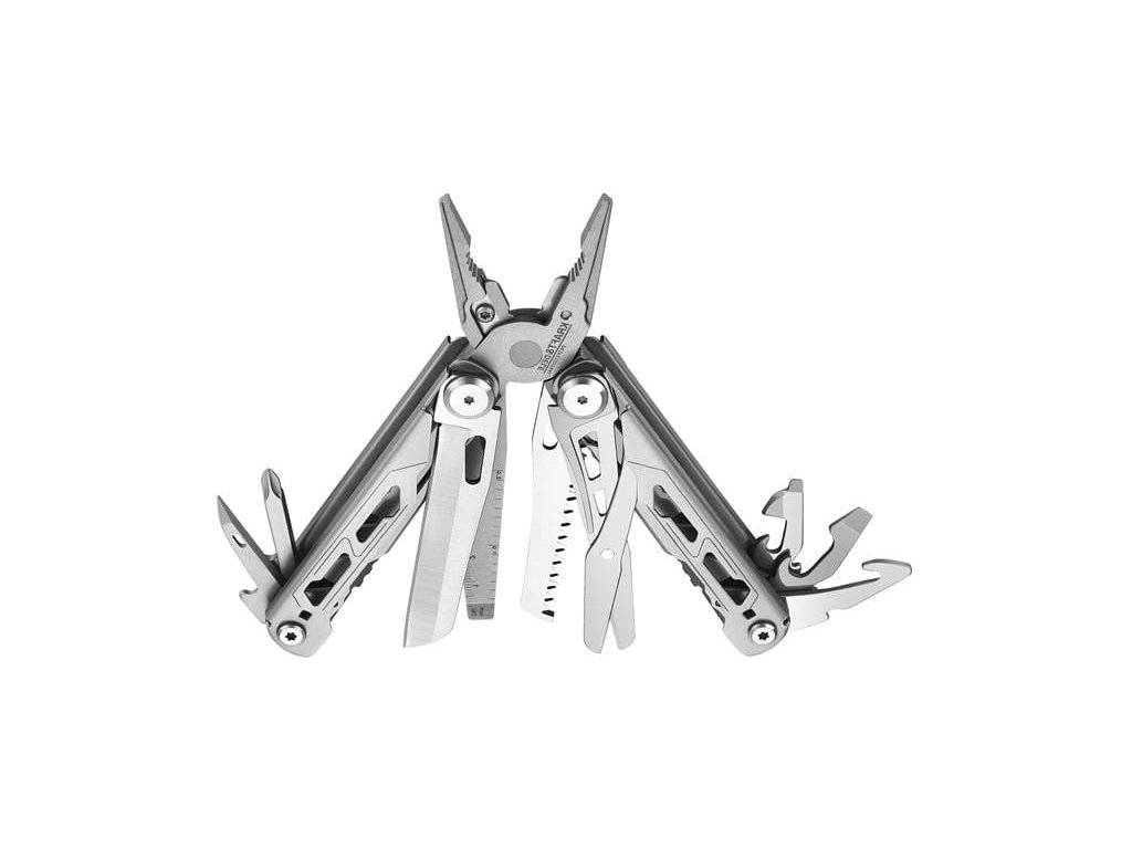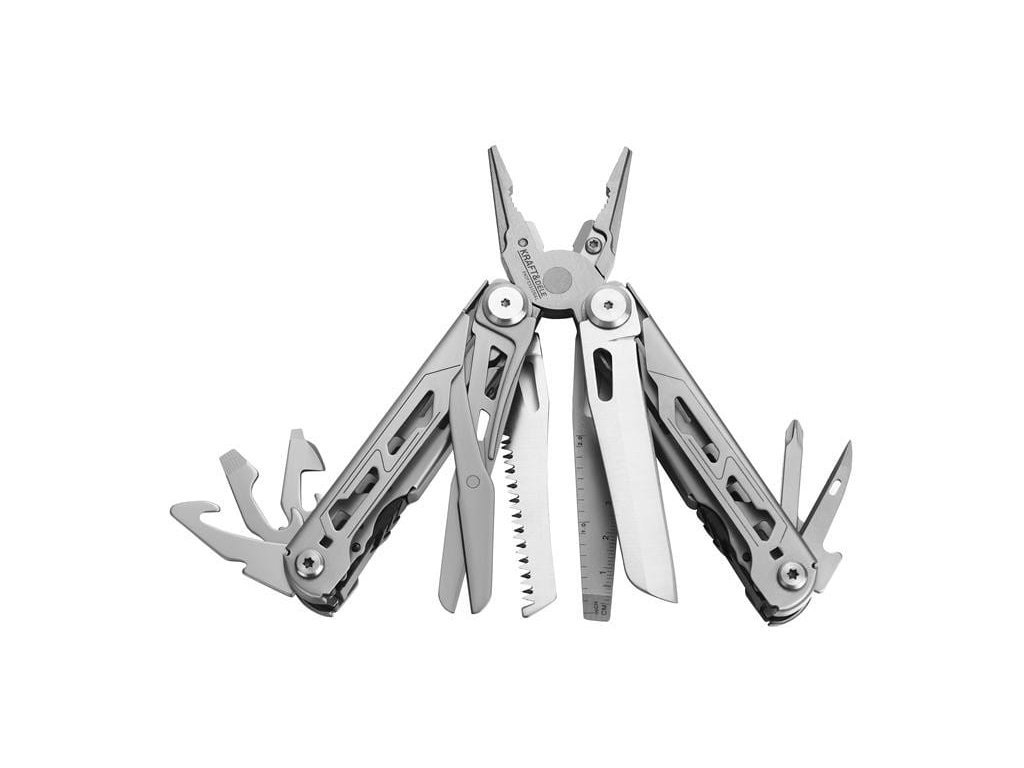 - Vybavené mnohými nástrojmi vrátane: noža, klieští, pílky na drevo, nožníc, krížového a plochého skrutkovača, pilníka a sady bitov