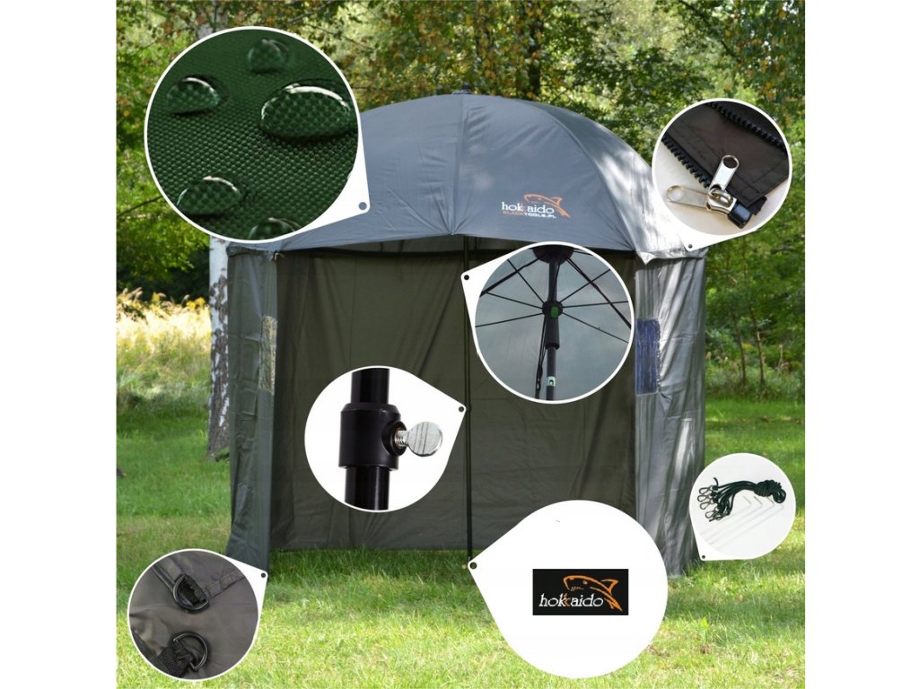 - 🌂 Rybársky dáždnik/stan Hokkaido 3-4 (220 cm) s bočnicami - skladací prístrešok vhodný pre dve osoby, dodávaný so sadou bočníc pre dokonalú ochranu pred vetrom a dažďom