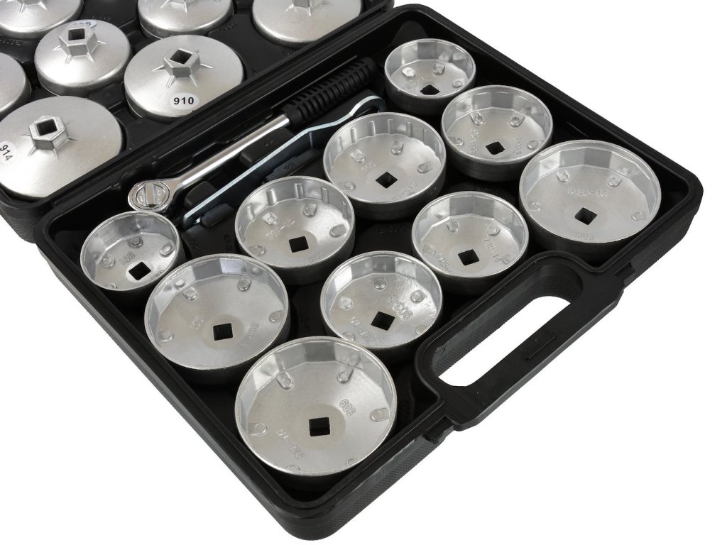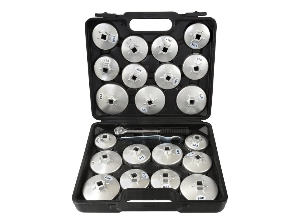 Súprava 21 nástavcov na odskrutkovanie olejových filtrov. Vhodné pre väčšinu osobných automobilov vyrábaných na európskych, amerických a ázijských trhoch.
