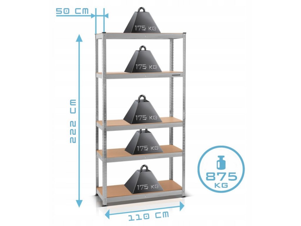 Každá z polícmôžete načítať do 175 kg. Celková nosnosť 5-policového regálu je preto pôsobivých 875 kg.