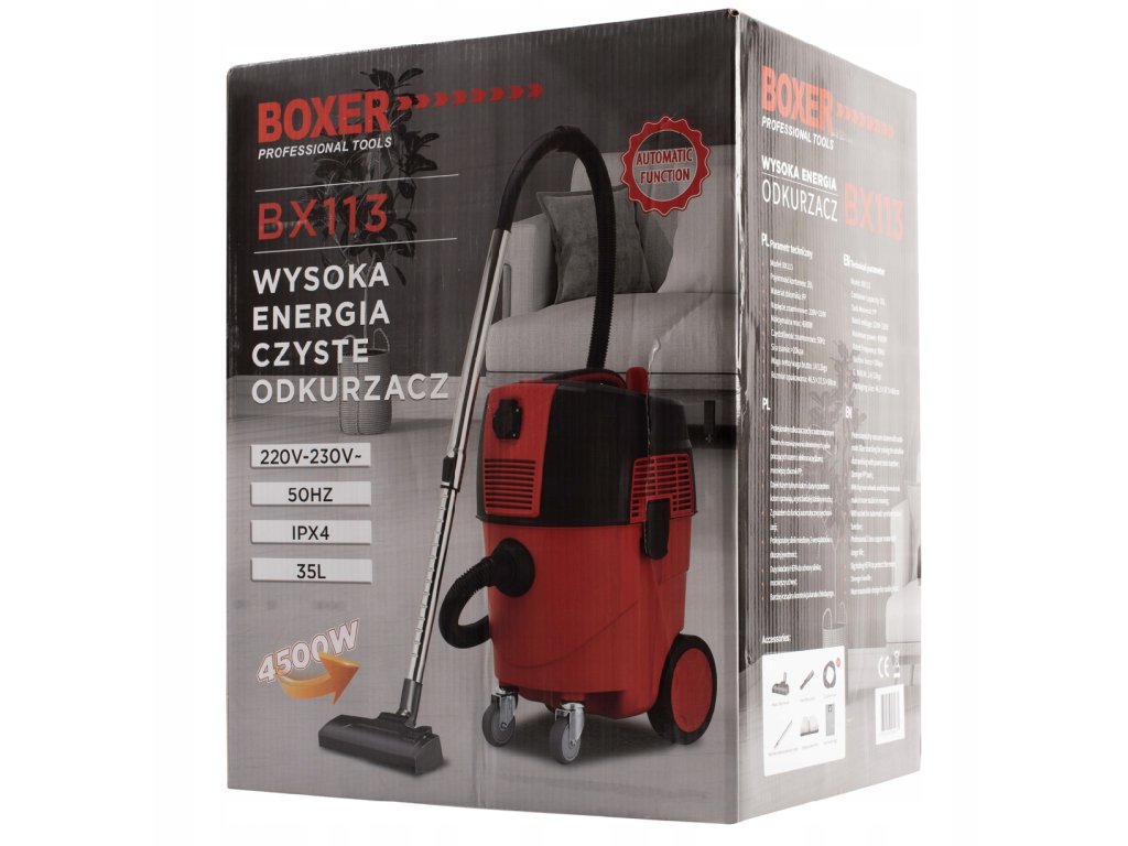 Univerzálnapriemyselný vysávač BOXER BX113 s mocou4500 W a objem 35 l je určený presuché aj mokré vysávanie v dielňach, garážach, na stavbách a čerpacích staniciach. K dispozícii odHEPA filter s automatickým vypínaním a zásuvka na náradie (do 2000 W) s funkciouautomatické zapínanie.
