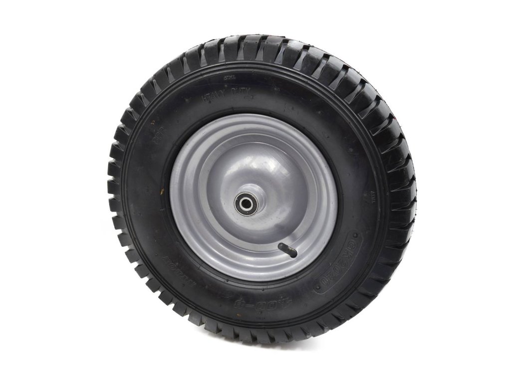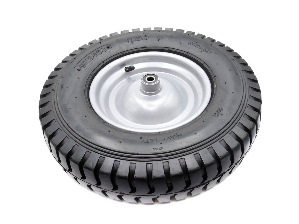 Koleso 4.00-8 8PR Heavy Duty pre trakare s maximálnou nosnosťou do 180 kg. Odolný kovový ráfik s práškovou povrchovou úpravou na zvýšenie stability. Celé koleso je vyrobené z vysokokvalitných materiálov. Súčasťou balenia je 12 mm os.