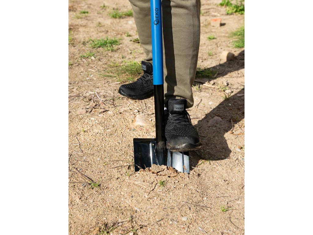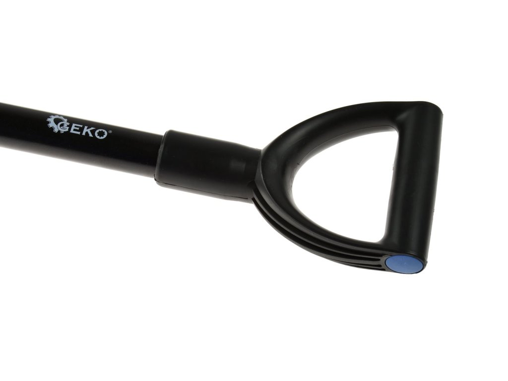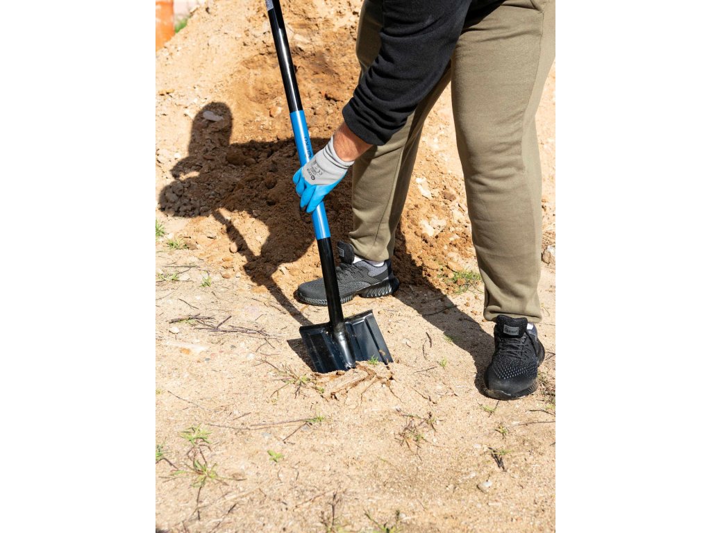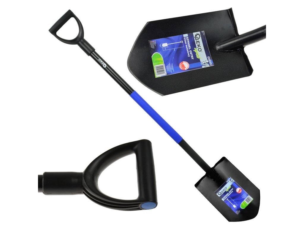 Vysokokvalitná ostrá lopata vyrobená z kalenej ocele. Zakrivená oceľová násada potiahnutá plastom, zakončená rukoväťou v tvare D z odolného plastu.