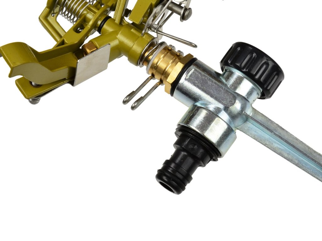 Robustný kovový impulzný zavlažovač. Priemer zavlažovania je maximálne 24 m v závislosti od tlaku vody. Zavlažovač je vybavený adaptérom, ktorý umožňuje rýchle a jednoduché pripojenie hadice pomocou rýchlospojky. Zavlažovacia plocha od 30 do 360° je..