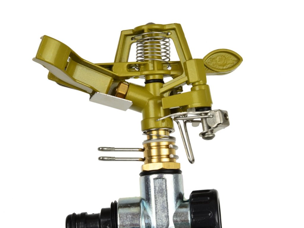 Robustný kovový impulzný zavlažovač. Priemer zavlažovania je maximálne 24 m v závislosti od tlaku vody. Zavlažovač je vybavený adaptérom, ktorý umožňuje rýchle a jednoduché pripojenie hadice pomocou rýchlospojky. Zavlažovaná plocha v rozsahu od 30 do 360° je nastaviteľná pomocou dvoch krúžkov. Výnimočnou výhodou tohto zavlažovača je jeho tichá prevádzka a účinný prietok vody. Nastaviteľný prietok vody podľa potreby - od prúdu až po rozptýlenú hmlu.