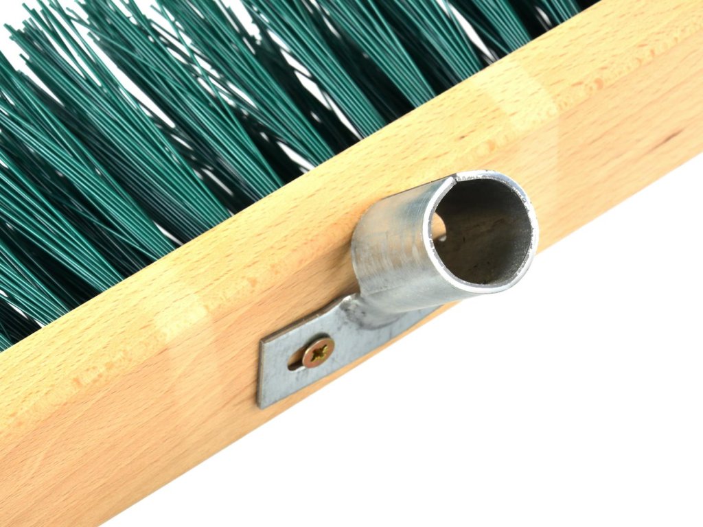 "Pouličný mop" s tvrdými nylonovými štetinami pripevnenými na drevenom tele. Kovová rukoväť na drevenú tyč bez závitu.
