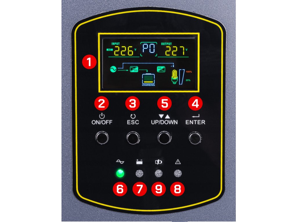 Spoľahlivý Interaktívna linka UPS sčistý sinus na bezpečné zálohovaniePC, smerovače, kotly, čerpadlá a citlivú elektroniku. StabilizáciaAVR vyhladzuje výkyvy siete,LCD zobrazuje napätie, zaťaženie, frekvenciu, režim a stav batérie.2× zásuvka 230 V, podporaexterná 12 V AGM/GEL batéria (možno rozšíriť paralelne) arýchle prepínanie < 10 ms minimalizovať riziko zlyhania. FunkcieStudený štart vám umožní štartovať iba z batérie.