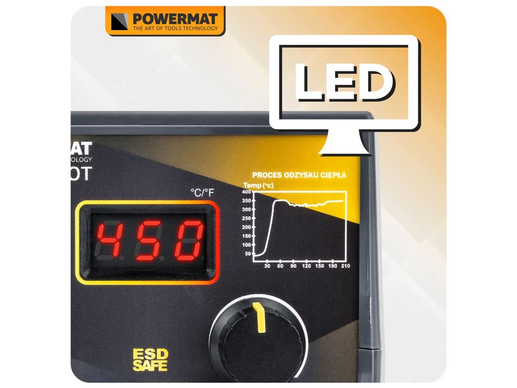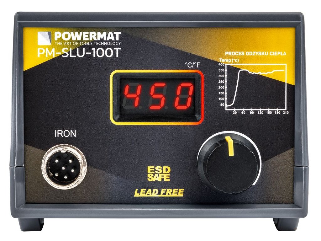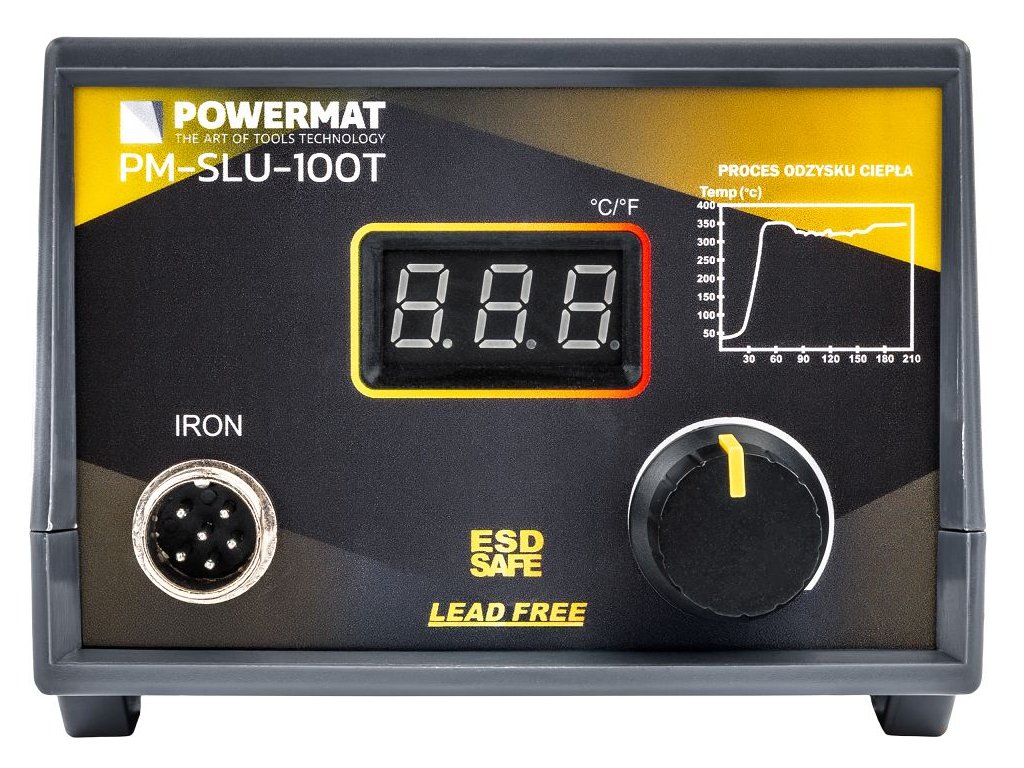 PowerMat PM-SLU-100T je spoľahlivá spájkovacia stanica s výkonom 100 W, širokým rozsahom nastavení teploty a rýchlym zahrievaním. S rozsahom 200 - 480 °C a stabilnou reguláciou je vhodná na jemné aj náročné spájkovanie, opravy elektroniky alebo montážne práce v dielni a domácom prostredí.