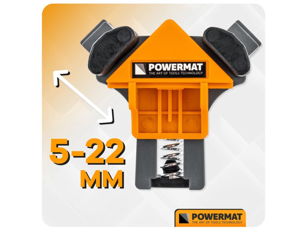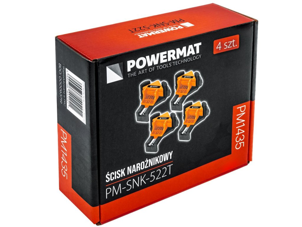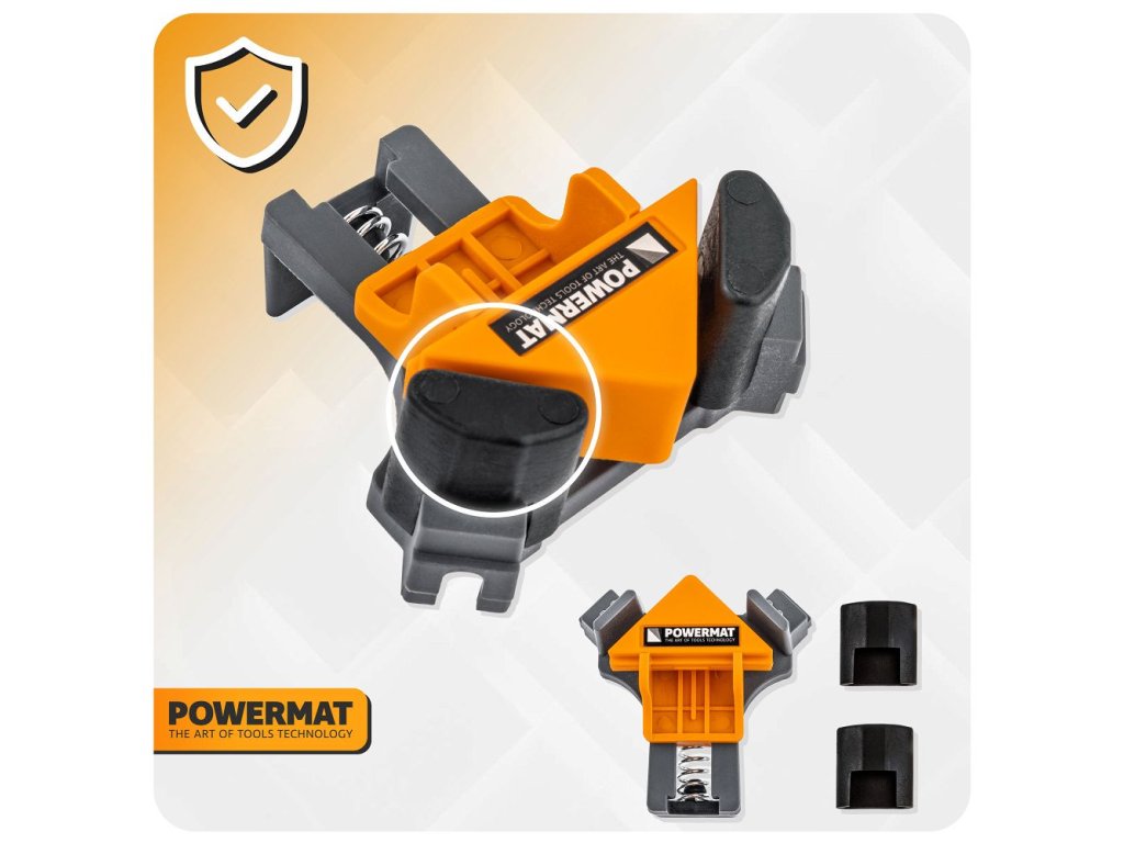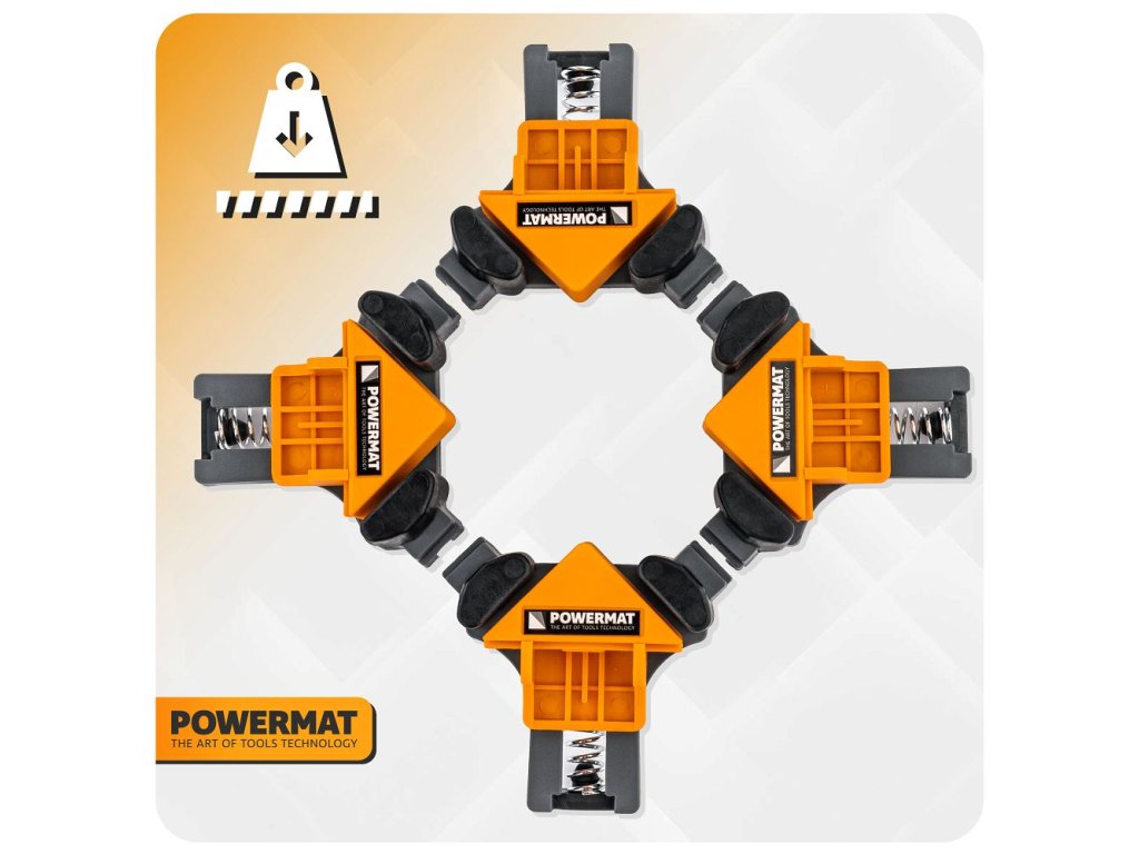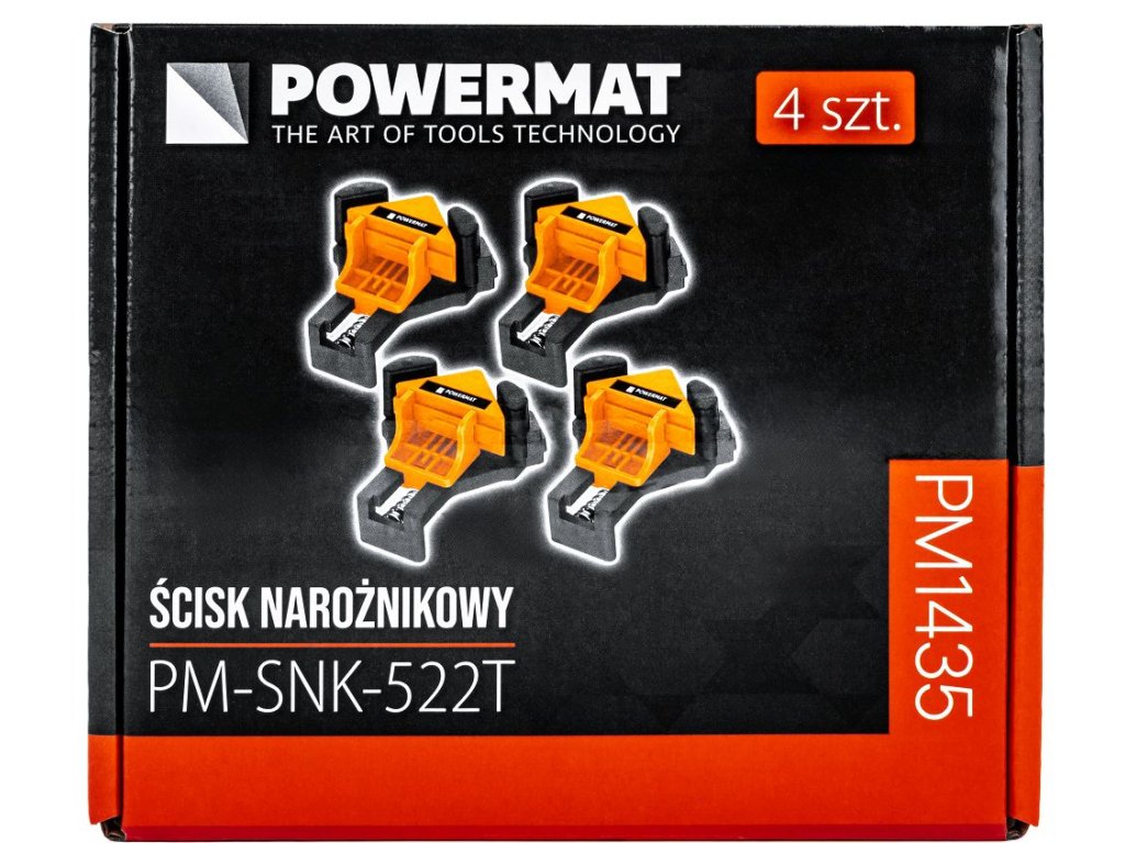 Rohové svorky PowerMat PM-SNK-522T sú určené na presné spájanie materiálov pod uhlom 90°. Ideálne na lepenie, skrutkovanie alebo zváranie rámov, krabíc, skríň a iných konštrukcií. Vďaka jednoduchému upínaciemu mechanizmu a súprave štyroch kusov umožňujú pevné a stabilné upevnenie materiálu zo všetkých strán.